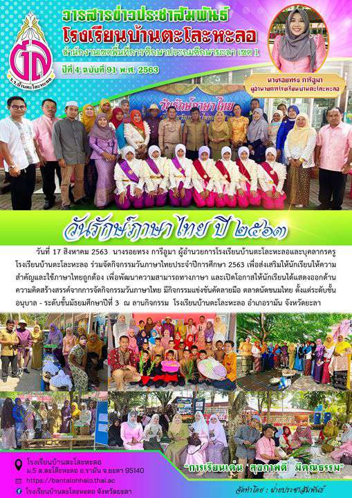" ข่าวประชาสัมพันธ์โรงเรียนบ้านตะโละหะลอ สพป.ยะลา เขต 1 ## ปีที่ 4 ฉบับที่ 91 พุทธศักราช 2563 ## วันรักษ์ภาษาไทย ปี 2563 " ^^