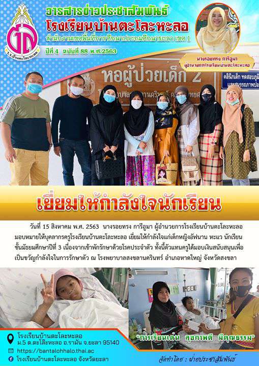 " ข่าวประชาสัมพันธ์โรงเรียนบ้านตะโละหะลอ สพป.ยะลา เขต 1 ## ปีที่ 4 ฉบับที่ 88 พุทธศักราช 2563 ## เยี่ยมให้กำลังใจนักเรียน " ^^