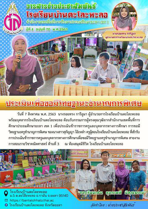 " ข่าวประชาสัมพันธ์โรงเรียนบ้านตะโละหะลอ สพป.ยะลา เขต 1 ## ปีที่ 4 ฉบับที่ 70 พุทธศักราช 2563 ## ประเมินเพื่อขอมีวิทยฐานะชำนาญการพิเศษ/ครูสุกัญญา โอ๊ะหลำ " ^^
