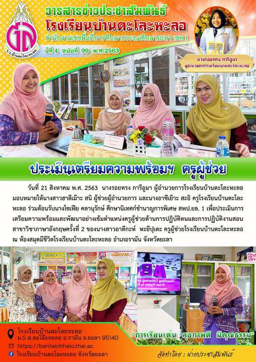 " ข่าวประชาสัมพันธ์โรงเรียนบ้านตะโละหะลอ สพป.ยะลา เขต 1 ## ปีที่ 4 ฉบับที่ 99 พุทธศักราช 2563 ## ประเมินเตรียมความพร้อมครูผู้ช่วย/ครูอาตีกะห์ หะยีปุเตะ " ^^