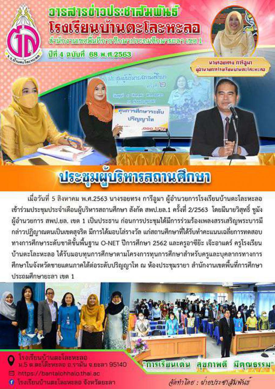 " ข่าวประชาสัมพันธ์โรงเรียนบ้านตะโละหะลอ สพป.ยะลา เขต 1 ## ปีที่ 4 ฉบับที่ 68 พุทธศักราช 2563 ## ประชุมผู้บริหารสถานศึกษา " ^^