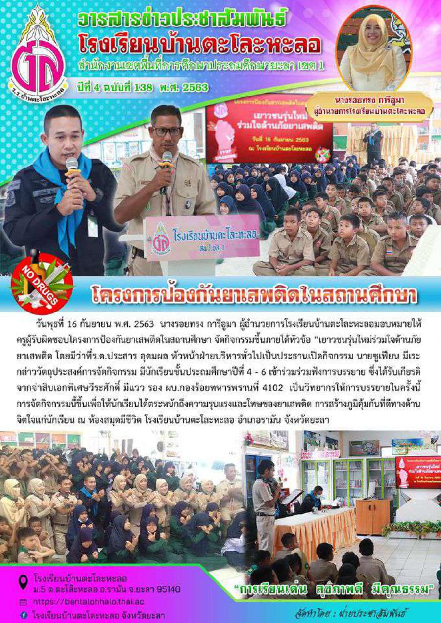 ขอขอบคุณจ่าสิบเอกพิเศษวีระศักดิ์ มีแววรองผอ.กองร้อยทหารพรานที่ 4102 ที่ฝห้เกียรติมาเป็นวิทยาการบรรยายตามโครงการ “เยาวชนรุ่นใหม่ร่วมใจต้านภัยยาเสพติด” ณ โรงเรียนบ้านตะโละหะลอ จังหวัดยะลา
